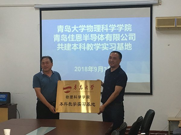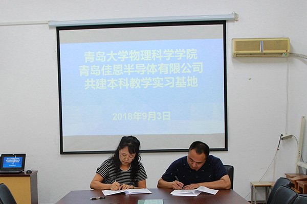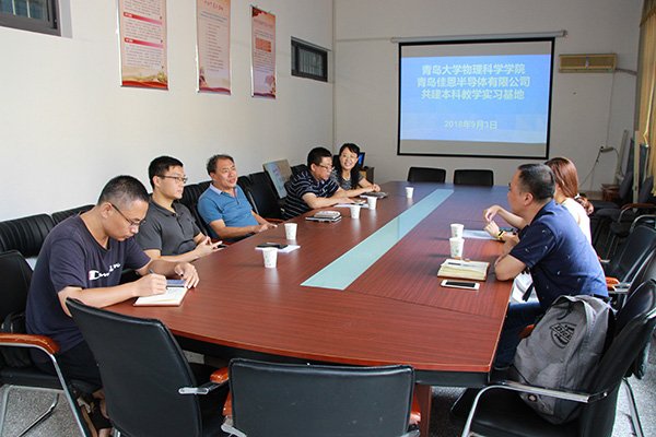 2018年9月3日上午,青島佳恩半導(dǎo)體有限公司與青島大學(xué)物理科學(xué)學(xué)院在博逸樓401會(huì)議室舉行了校企結(jié)合活動(dòng)。公司總經(jīng)理王丕龍,物理科學(xué)學(xué)院黨委書(shū)記黃國(guó)俊、院長(zhǎng)滕冰、黨委副書(shū)記周志強(qiáng),以及雙方其他相關(guān)人員參加了活動(dòng)。