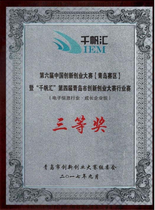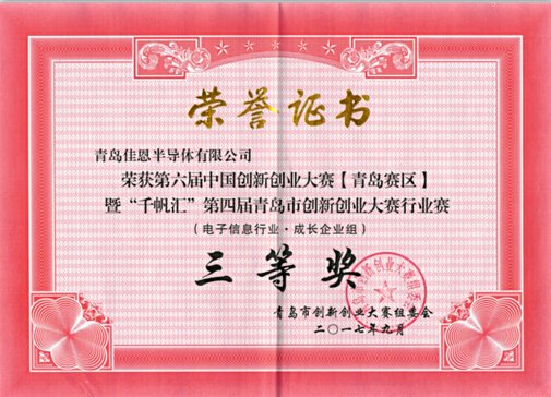 2017.8.4日,第六屆中國創(chuàng)新創(chuàng)業(yè)大賽[青島賽區(qū)]暨“千帆匯”第四屆青島市創(chuàng)新創(chuàng)業(yè)大賽完美落幕,由王丕龍、徐旭、王新強帶領青島佳恩半導體再創(chuàng)戰(zhàn)績,榮獲企業(yè)組電子信息項三等獎。