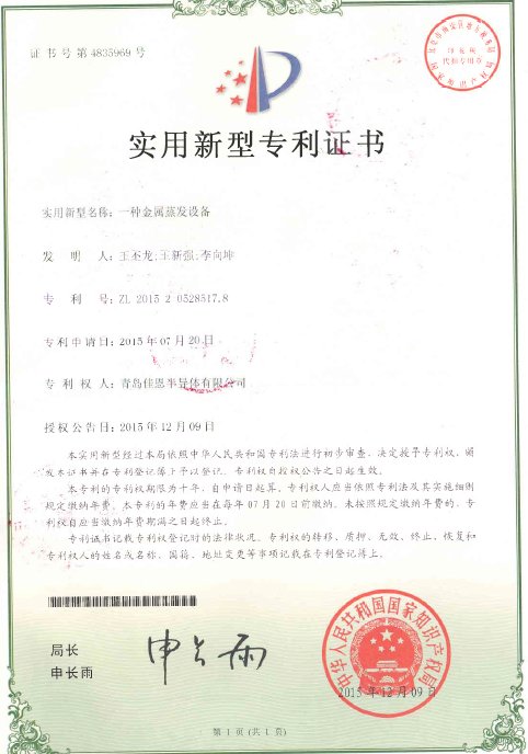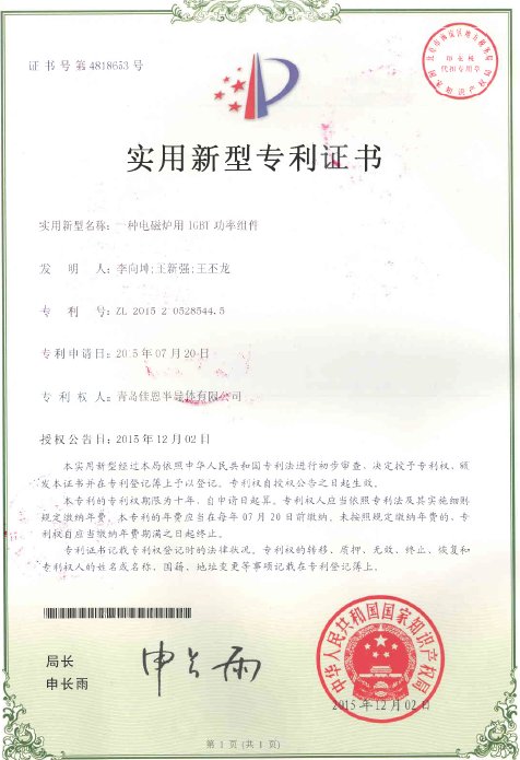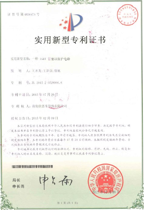 青島佳恩半導體有限公司小波實用新型專利證書已到位,大批專利證書正在路上!